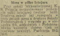 Przy sekcji lekkoatletycznej K.S. Polonja zorganizowano podsekcję piłki latającej (wolley ball). Drużyna sekcji tej rozegrała w tych dniach mecz z drużyną Szkoły Podchorążych i wygrała go w stosunku 2:0, aczkolwiek i Podchorążówka walczyła dobrze (jak na pierwsze zawody). Punktacja 15:2, 15:0."