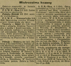z przewagą Polonji, w drugiej Grażyny. W Polonji b. dobra p. Grabowska w bramce i Szymańska w ataku, która strzeliła 3 bramki, czwartą „zawijaną" wbiła p. Szmidówna. W Grażynie najlepsza pomoc. Sędzia p. Orłowicz."