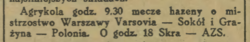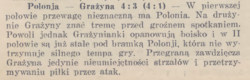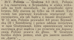 "Polonja — Grażyna 4:3 (4:1) — W pierwszej połowie przewagę nieznaczną ma Polonia. Na drużynie Grażyny znać tremę przed groźnem spotkaniem. Powoli jednak Grażynianki opanowują boisko i w II połowie są już stale pod bramką Polonji, która nie wytrzymuje silnego tempa gry. Przegraną zawdzięcza Grażyna jedynie nieumiejętności strzałów i przetrzymywaniu piłki przez atak."