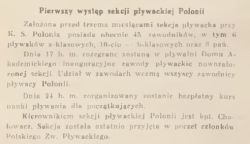 "Założona przed trzema miesiącami sekcja pływacka przy KS Polonia posiada obecnie 45 zawodników, w tym 6 pływaków a-klasowych, 10-ciu b-klasowych oraz 8 pań. Dnia 17 b.m. rozegrane zostaną w pływalni Domu Akademickiego inauguracyjne zawody pływackie nowozałożonej sekcji. Udział w zawodach wezmą wszyscy zawodnicy pływacy Polonii. (...)