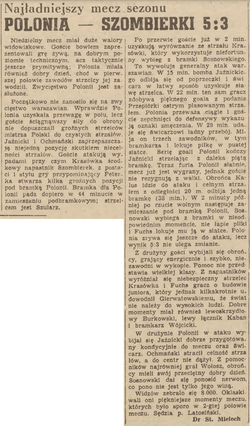 Początkowo nie zanosiło się na zwycięstwo warszawian. Wprawdzie Polonia uzyskała przewagę w polu, lecz goście ściągnąwszy siły do obrony nie dopuszczali groźnych strzelców mistrza Polski do czystych strzałów. Jaźnicki i Ochmański zaprzepaszczają niejedną pozycję skutkiem niecelności strzałów. Goście atakują wypadami przy czym Krasówka środkowy napastnik Szombierek, z postaci i stylu gry przypominający Peterka stwarza kilka groźnych pozycji pod bramką Polonii. Bramka dla Polonii pada dopiero w 44 minucie w