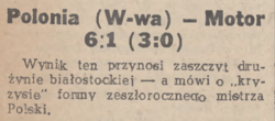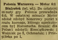 BIAŁYSTOK (tel.). Polonia warszawska wygrała w Białymstoku 6:1 (3:0) z Motorem.- Bramki dla Polonii: Wożnisk 4, Ochmański i