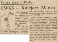 Mecz ten będzie powtórzeniem spotkania z dn. 13.5. br., które mimo półgodzinnego przedłużenia dało wynik 2:2. Po tym meczu obi kluby rozegrały spotkanie o mistrzostwo Ligi, które przyniosło zwycięstwo CWKS 1:0. Oba te wyniki świadczą o równości sił; wynik spotkań tych dwóch klubów zależy więc od chwilowej dyspozycji zawodników. Ponieważ w ostatnich zawodach o mistrzostwo Ligi Kolejarz miał lepsze wyniki, głównie dzięki poprawie gry napadu (Łącz i Popiołek), w meczu czwartkowym jest uważany za faworyta.