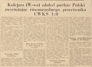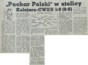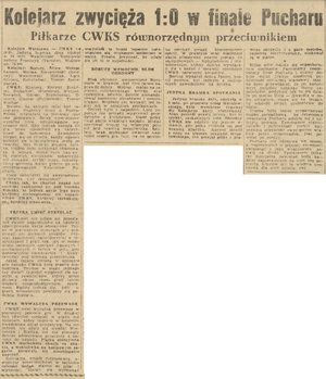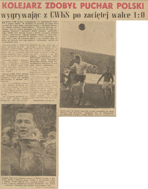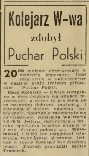 Po zakończonym spotkaniu odbyło się uroczyste wręczenie Pucharu Polski zwycięskiej drużynie przy akompaniamencie radosnych okrzyków zwolenników Kolejarza, którzy odśpiewali na cześć zwycięzców "100 lat niech żyją nam“. Wręczając drużynie Kolejarza Puchar Polski, przewodniczący GKKF tow. Reczek podkreślił, że zaszczyt jaki spotkał sympatyczną i popularną w stolicy drużynę kolejarza, będzie niewątpliwie dla niej bodźcem do zwiększenia wysiłków, do utrzymania Pucharu w przyszłym roku i powrotu do pierwszej ligi. Runda honorowa dookoła boiska zakończyła to pamiętne w dziejach stolicy spotkanie piłkarskie. (...)"