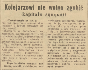 Już dawno na Stadionie WP nie panowała tak pełna napięcia atmosfera, jak podczas niedzielnego finałowego meczu o Puchar Polski. Cały poprzedzający tydzień, zwolennicy piłkarstwa stołecznego obliczali szanse obu walczących o Puchar drużyn, przewidując najrozmaitsze ewentualności. Z chwila gdy stało się wiadome, że w Kolejarzu wystąpi ponownie Borucz w bramce, zwolennicy Kolejarza uznali, że szanse tej drużyny wzrosły. Istotnie obecność Borucza sprawiła, że linia obronna Kolejarza, która w ostatnich spotkaniach była najmniej pewną formacją, w niedziele była nie tylko podporą całej drużyny, ale stała się też zaporą nie do pokonania dla napadu przeciwnika.