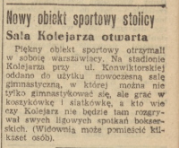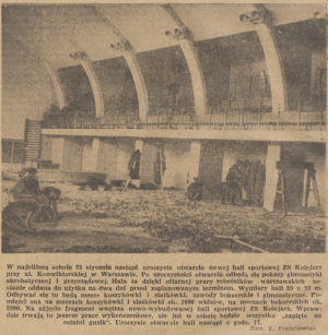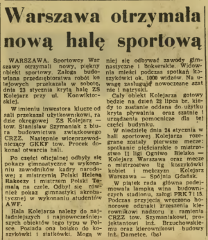 W najbliższą sobotę 23 stycznia nastąpi uroczyste otwarcie nowej hali sportowej ZS Kolejarz przy ul. Konwiktorskiej w Warszawie. Po uroczystości otwarcia odbędą się pokazy gimnastyki akrobatycznej i przyrządowej. Hala ta dzięki ofiarnej pracy robotników warszawskich zostanie oddana do użytku na dwa dni przed zaplanowanym terminem. Wymiary hali 29 × 20 m. Odbywać się tu będą mecze koszykówki i siatkówki, zawody bokserskie i gimnastyczne. Pomieści ona na meczach koszykówki i siatkówki ok. 1000 widzów, na meczach bokserskich około 2000. Na zdjęciu fragment wnętrza nowo-wybudowanej hali sportowej ZS Kolejarz. Wprawdzie trwają tu jeszcze prace wykończeniowe, ale już w sobotę będzie wszystko „zapięte na ostatni guzik”. Uroczyste otwarcie hali nastąpi o godz. 17.