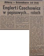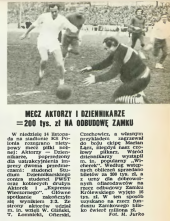 Widownia przepełniona, mimo że unieważniono wszystkie karty wolnego wstępu. Płatne bilety jak „świeże bułeczki”, wykupiono już w przedsprzedaży. Bo też cel tej atrakcyjnej imprezy był wzniosły: dochód przeznaczono na budowę ZAMKU KRÓLEWSKIEGO. Bramki strzelali: Łącz i Jan Englert dla Aktorów oraz Hopfer i Kubiak dla Dziennikarzy. Nasz zespół dość długo prowadził 2:0, jednak ostatecznie – mecz zakończył się wynikiem remisowym 3:3.