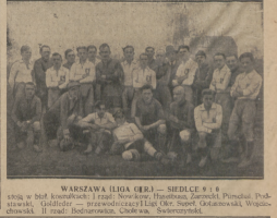 Stoją od lewej: Tadeusz Grabowski II, Michał Hamburger, ?, Stefan Loth I, Wacław Loth IV, Stefan Jelski, płk. Erwin Więckowski, Janusz Maderski, Mieczysław Ałaszewski, Andrzej Nowikow, Feliks Gross, Aleksander Tupalski. Kuca: Stefan Dąbrowski (członek klubu). Siedzi z pucharem: Mieczysław Zimowski. Opis drużyny Piotr Gros.1927-05-03 Siedlce - Warszawa 0:9; Przegląd Sportowy nr 19 z 14.05.1927, s. 6