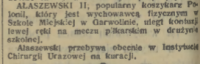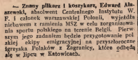 Znany piłkarz i koszykarz, Edward Ałaszewski, absolwent Centralnego Instytutu W.F. i członek warszawskiej Polonii, wyjeżdża niebawem z ramienia MSZ w celu zorganizowania sportu polskiego na terenie Belgii. Pierwszym jego zadaniem będzie przygotowanie polskiej ekipy emigracyjnej na przyszłoroczne igrzyska Polaków z Zagranicy, które odbędą