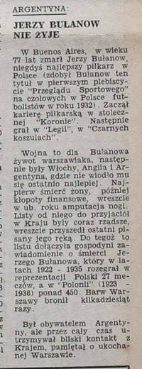 "(...) Nasze spotkanie [autora artykułu z Borysem Bułanowem] zbiegło się z bardzo radosnym wydarzeniem w rodzinie Bułanowych, na statku „Mickiewicz” przybyła do Argentyny żona Jerzego Bułanowa, wieloletniego kapitana polskiej drużyny reprezentacyjnej. Nie widzieli się 14 lat. W 1946 roku z Włoch pojechała do Polski, a kiedy po pewnym czasie chciała wrócić do męża przez zieloną granicę — wpadła w łapy bezpieki. Przesiedziała blisko dwa lata w więzieniu."