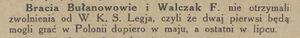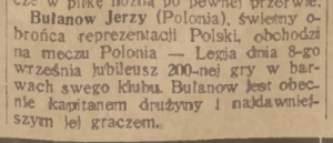 kontuzją — dość często zdarzającą się w piłkarstwie. Wszystko się udawało. Aż na jednym z meczów o mistrzostwo Polski („Polonia“ — „Wilia“ rok 1923) w czasie gry Bułanow zawadził pierścionkiem o koszulkę przeciwnika. Pierścionek pękł i zsunął się na trawę. W kilka minut później Bułanow został kontuzjowany tak ciężko, że leżał przez pół godziny nieprzytomny. Pierścionek z trudem znaleziono w trawie i oddano właścicielowi, który z chwilę dojścia do świadomości, skwapliwie się o niego dopominał.(...)"