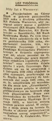 sportu i wych. fizycznego. Zgodziłem się na tę propozycję i 1 listopada 1920 roku objąłem te obie czynności, przebywając na G. Śląsku bez przerwy do końcowych dni maja 1921 roku, co m.in. umożliwiała mi wyrobiona dla mnie tzw. "Gruenkarta", dająca prawo pobytu w okresie plebiscytowym na terenach objętych głosowaniem. Prace swe