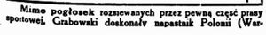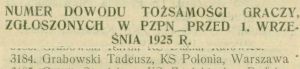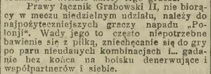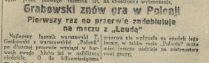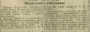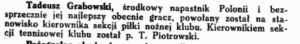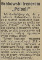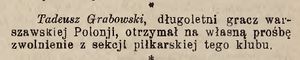 "(...) Dziś inż. Tadeusz Grabowski powrócił znów do piłki nożnej. Oczywiście nie jako zawodnik, ale jako działacz, zawsze całym sercem oddany piłce i sportowi. Inż. Grabowski powołany został do Rady Seniorów reaktywowanego klubu "Polonia" oraz pracuje już od kilku miesięcy jako przewodniczący Sekcji Młodzieżowej PZPN. (...)"