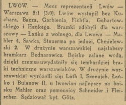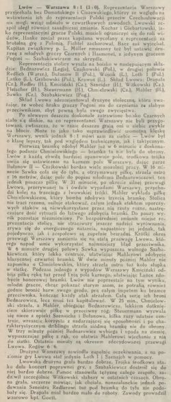 | strzelcy bramek gospodarz = | | strzelcy bramek gospodarz = 1-0 Mahler 5' (as. Chmielowski) <br> 2-0 Sawka 19' <br> 3-0 Chmielowski 30' (as. Mahler) <br> 4-0 Mahler 50' (as. Sawka) <br> 5-0 Sawka 52' <br> 6-1 Mahler 70' <br> 7-1 Zygmunt Steuermann 83' <br> 8-1 Mahler 87' <br> | ||