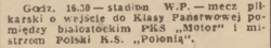 Historia bramek przedstawia się następująco: pierwszy punkt we wczorajszym meczu zdobył lewoskrzydłowy "Motoru" Lachowski. Wyrównał junior „Polonii" — Chmieliński. Lewy łącznik białostocczan — Horoszucha ustalił wynik do przerwy na 2:1. Po przerwie bramki dla Polonii zdobyli Świcarz — dobiwszy piękny strzał Ochmańskiego, Szularz — który zdobył dwie kolejne bramki, następnie Ochmański ostrym strzałem pod poprzeczkę i dwie ostatnie Świcarz, dzięki wydatnej pomocy Brzozowskiego.