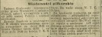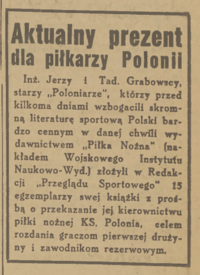 "(...) Dziś inż. Tadeusz Grabowski powrócił znów do piłki nożnej. Oczywiście nie jako zawodnik, ale jako działacz, zawsze całym sercem oddany piłce i sportowi. Inż. Grabowski powołany został do Rady Seniorów reaktywowanego klubu "Polonia" oraz pracuje już od kilku miesięcy jako przewodniczący Sekcji Młodzieżowej PZPN. (...)"